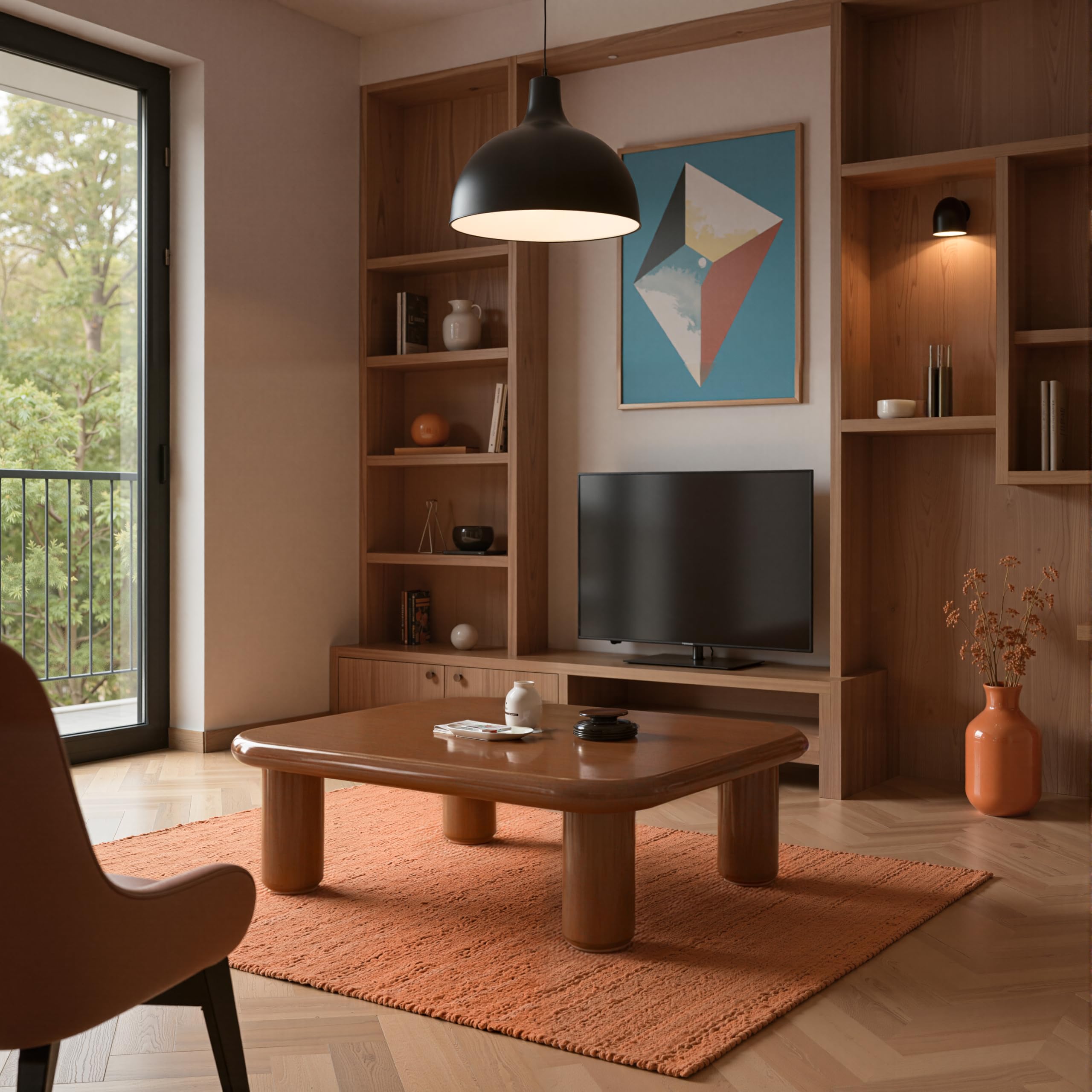 - Statement coffee table: The living room center table features a striking high-gloss top with softly rounded corners and four substantial cylindrical legs, creating a bold architectural presence that serves as a room's focal point.