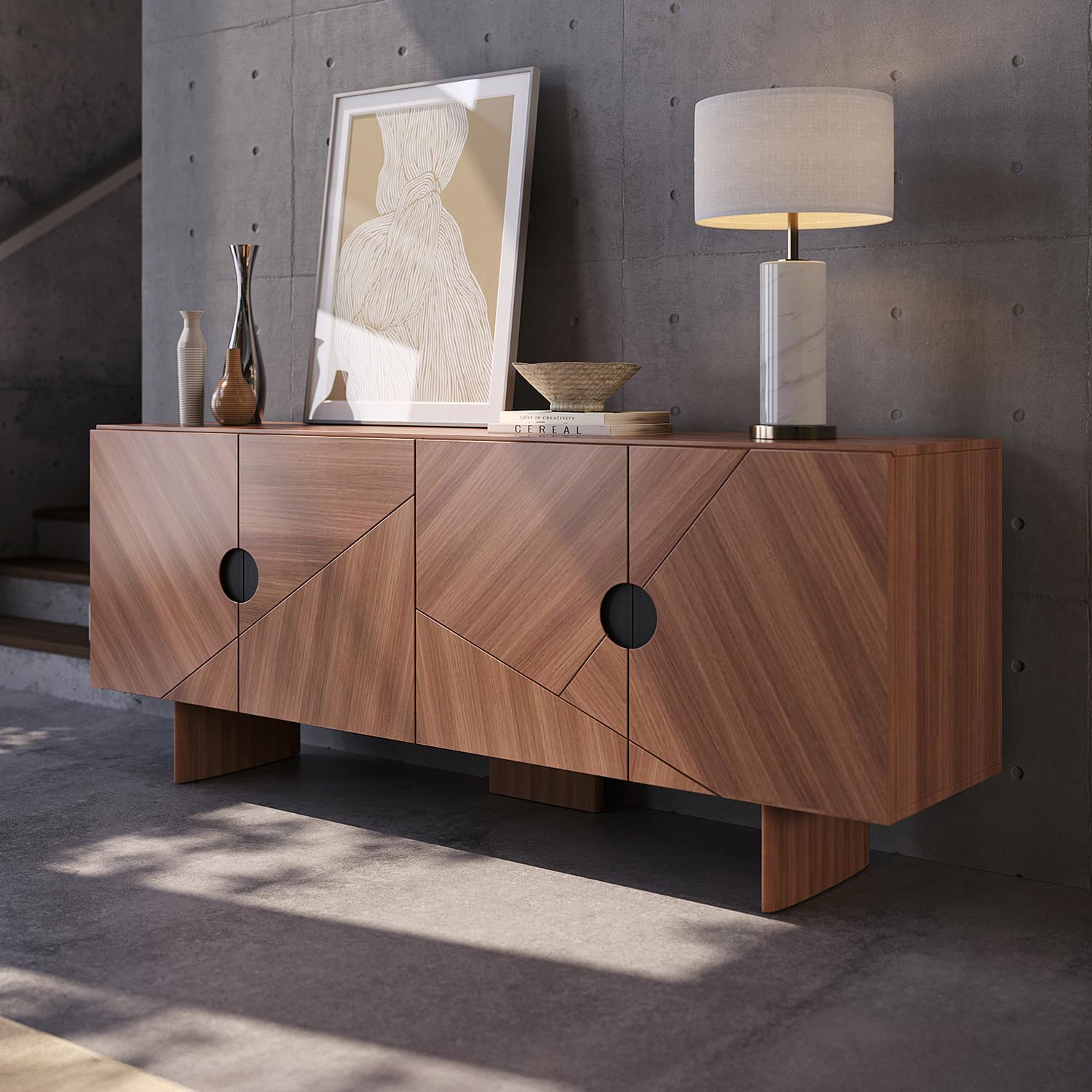 - Stylish mid-century design: The long buffet cabinet with storage showcases premium walnut veneer with geometric pattern matching, circular black handles, and clean lines for a sophisticated statement piece.