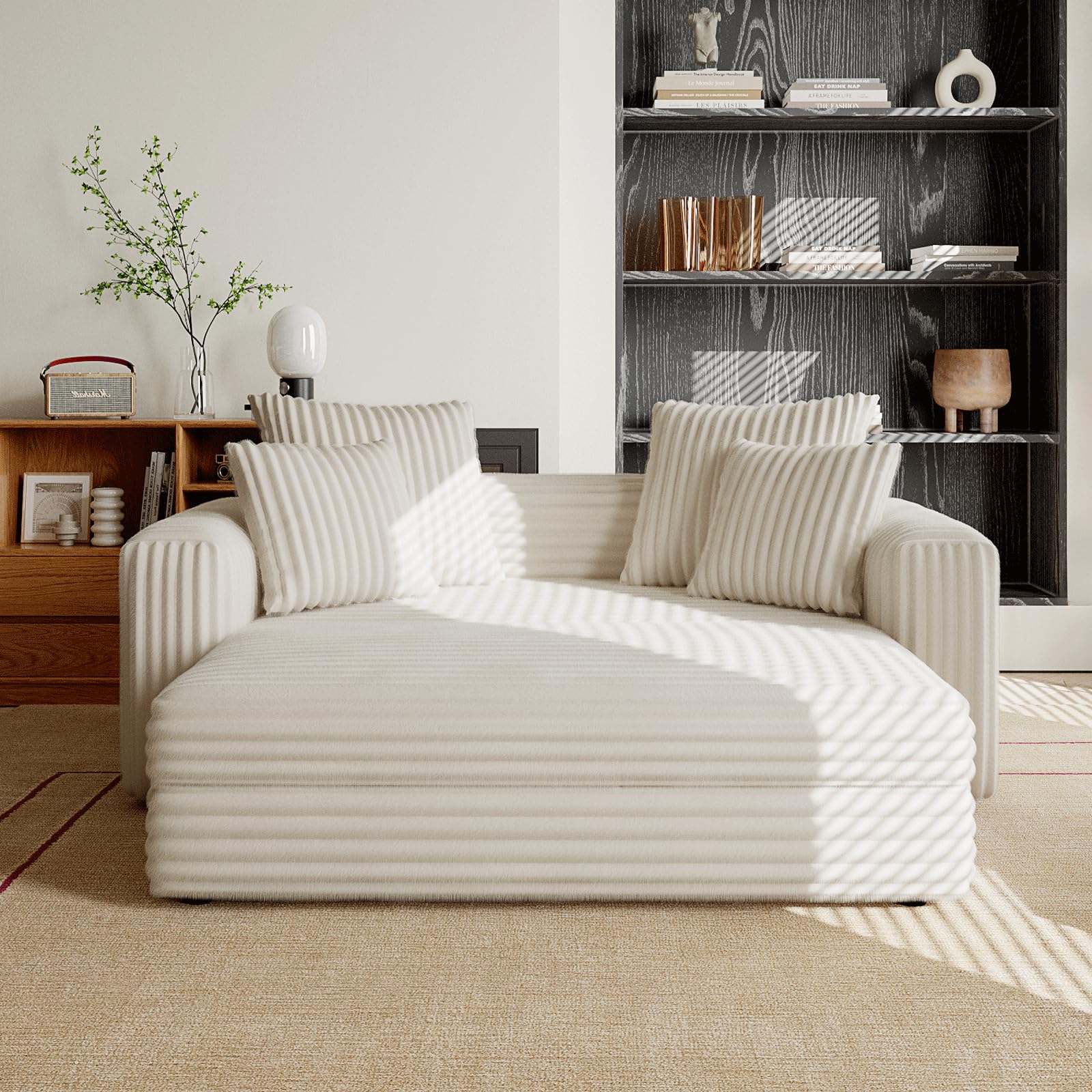 - Oversized cozy chaise - The loveseat sofa is made of plush striped faux fur fabric, which is gentle to the touch, soft, and skin-friendly. With extra deep seat, this chaise bed lets you effortlessly find your perfect position for utmost comfort, ensuring you enjoy the serenity of your stay on this sleeper chair.